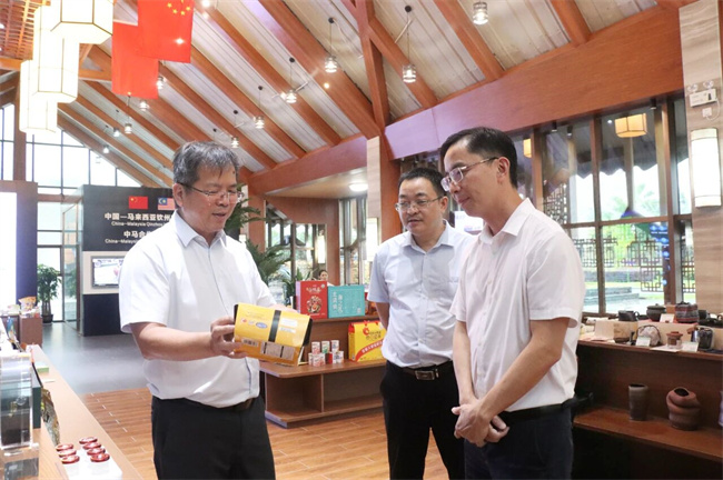 在中马广场创新合作中心现场,叶俊结合成品样品听取棕榈油产业生态介绍,观摩棕榈产业人工智能平台实操演示,参观中国—东盟特色商品展示展销区,通过听介绍、看实物、问细节,详细了解项目建设进度和技术优势,并与中马合资公司总裁陈思进就公司招商引资工作推进情况和实际需求进行深入交流。