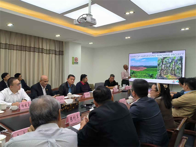 海南油棕研究中心组织了交流会,会上马来西亚油棕机械化与自动化研究联盟主席罗斯林介绍此次来访目的,随后马来西亚棕榈油总署团队重点介绍了马来西亚油棕园对采摘设备的市场需求,包括设备性能、功能设计、关键部件等方面的具体需求及技术建议,强调希望逐步推动设备自动化、智能化升级,促进棕榈园种植效率提升与行业可持续发展。