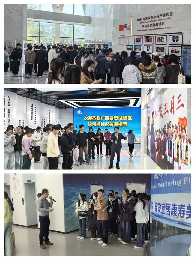 期间,师生们分两批次先后探访园区海浪广场、中马文化长廊、钦州港片区展厅、中交金鼓台、海铁联集中心展厅及钦州保税港国际集装箱码头等核心点位。在中马文化长廊,讲解员通过珍贵图片、详实文字与生动讲解,系统呈现中马“两国双园”的合作背景、园区发展进展及合作成果,深入解读马来西亚华人文化等特色内容,让师生们直观感受中马两国携手共赢的深厚情谊与历史文化纽带;在中国—东盟(绿色棕榈产业)人工智能创新合作平台项目展区,通过实物展示、场景化介绍等形式,详细阐释人工智能与棕榈产业深度融合的创新实践,以及人工智能在东盟农业产业的应用场景,助力学生拓宽科技视野、激发创新思维;在钦州保税港集装箱码头,师生们通过实地观摩,直观了解现代港口的运作模式、智能化设备应用及发展成就;在海铁联集中心展厅,讲解员借助动态沙盘、物流航线图及实时数据监测系统,介绍了中心 “海铁联运、公铁互补” 的多式联运体系,阐释其西南地区跨境物流枢纽的核心优势。
